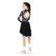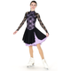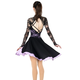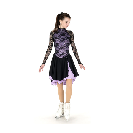 A sophisticated style with lovely lace sleeves and a lacy bodice with high neck underscored by sparkling sequins. A diamond window pane back and double layer skirt with a slit at one thigh add extra appeal. Lined in black lycra.