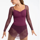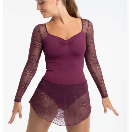 Abril Skating dress Long Sleeve Skirted Dress Ruched pleats at the neckline Tonal lace fabric on the skirt, back and sleeves lined front Scrunchie included available in color 275-Granate