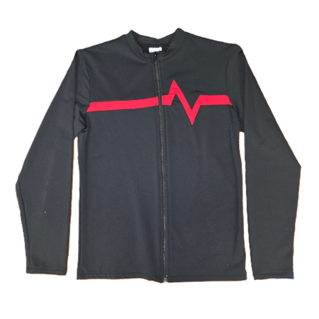 Black front zip sport jacket with red contrast stripe that spikes on one side.